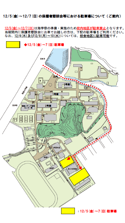標記のことについて3点のご連絡です。 ①日程・資料について 12/4(木)~12/10(水)に後期保護者懇談会が実施いたします。 保護者様向けの資料は次のとおりです。 R7後期保護者懇談会資料 ※11/28 P8の情報を一部更新いたしました。 ②12/5~12/7の駐車場について(海学祭準備日・期間中) ※12/4(木)及び12/8(月)~10(水)については、校舎地区に駐車可能です。 海学祭準備日・開催期間中、保護者懇談会参加のために来校される方に対して専用の駐車スペースをご用意いたします。 入口の警備員に保護者会で来校した旨をお伝えいただき、本校第二体育館隣の駐車場をご利用ください。 ※海学祭で来校される方の駐車場はございません。 ③お伊勢さんマラソンにともなう交通規制について 12月6・7日は「お伊勢さんマラソン」開催のため、伊勢市内で一部交通規制のかかっている箇所がございます。 お車でお越しの際は、下記サイトをご参照ください。 【参照】お伊勢さんマラソン交通規制について(※伊勢市HPリンク) https://www.city.ise.mie.jp/marathon/1005387.html
