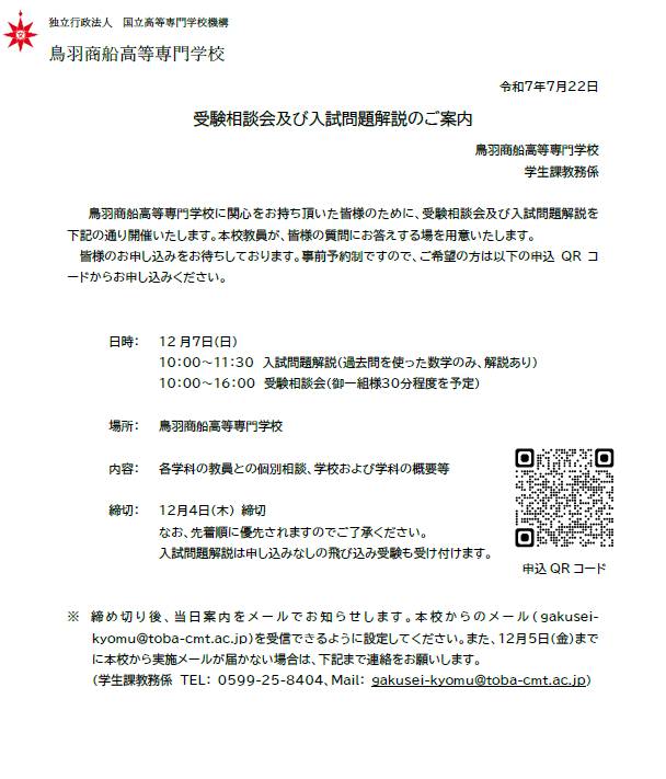 新着情報 「受験相談会・入試問題解説」の情報を更新しました。(10/7更新) 「中学校教員向け説明会」の情報を更新しました。(6/24更新) 「オープンキャンパス(7月、8月、10月)」の情報を更新しました。(6/10更新) 「授業見学ツアー」を追加しました。(6/5更新) 「オープンキャンパス(7月、8月、10月)」を追加しました。(5/23更新) 令和7年度の入学・入試に関する説明会・学校見学について 1)入試・オープンキャンパス等のイベント開催のメール連絡(随時) 2)どこよりも早いっI?高専を知るWeb学校説明会(5~7月) 3)オープンキャンパス(7月、8月、10月) 4)塾・予備校向け説明会(10月) 5)中学校教員向け説明会(10月、11月) 6)授業見学ツアー(11月、その他ご要望に応じて) 7)受験相談会・入試問題解説(12月) 8)その他 を予定しております。 その他、説明会やイベント情報につきましては、随時情報を更新していきます。 4月 5月 6月 7月 8月 9月 ・Web学校説明会 ・Web学校説明会 ・国公私立高専合同説明会 ・Web学校説明会 ・中学校教員向け説明会 ・オープンキャンパス ・オープンキャンパス 10月 11月 12月 1月 2月 3月 ・中学校教員向け説明会(高度情報エンジニア育成特別選抜) ・オープンキャンパス ・塾・予備校向け説明 ・中学校教員向け説明会(推薦選抜、体験学習選抜選抜、学力検査選抜) ・授業見学ツアー ・受験相談会・入試問題解説 入試・オープンキャンパス等のイベント開催のメール連絡(随時) ※ぜひご登録ください。 本校の入試・オープンキャンパス等のイベント開催情報をメールにてお知らせいたします。開催イベントについてお見逃しのないよう、ぜひご登録ください。 ※年度途中で配信を停止することも可能です。 ※フォームにご登録いただいた内容は,入試広報に関してのみ利用いたします。なお、必要に応じて生徒氏名等の情報は所属する中学校にも提供いたしますので、あらかじめご了承ください。 メール連絡登録フォーム 〇問い合わせ先 鳥羽商船高等専門学校学生課教務係(入試担当) 電話番号:0599-25-8404 メール:gakusei-kyomu@toba-cmt.ac.jp どこよりも早いっ!?高専を知るWeb学校説明会(中学生、保護者、中学校の先生および塾の先生 5~7月) 中学生、保護者の方、中学生の進路指導の先生、塾の先生を対象に、以下の要領で本校の概要・入学試験等についての説明会を、遠隔地の人の参加しやすいオンラインで開催します。お気軽にご参加ください。 鳥羽商船主催Web学校説明会(オンライン説明会) 事前の参加申込が必要です。下記の申込フォームからお申込ください。 Web学校説明会申込フォーム 1.開催日 ・令和7年5月9日(金)18:00~19:00(申込締切:5/6(火)) ・令和7年5月23日(金)18:00~19:00(申込締切:5/20(火)) ・令和7年6月13日(金)18:00~19:00(申込締切:6/10(火)) ・令和7年6月27日(金)18:00~19:00(申込締切:6/24(火)) ・令和7年7月11日(金)18:00~19:00(申込締切:7/8(火)) ・令和7年7月25日(金)18:00~19:00(申込締切:7/22(火)) ※いずれも同じ内容です。 ※お申込みいただいた際にいただいたご質問について、 こちらのQ&A集(7/25更新)にまとめましたのでご確認ください。 <お申込みいただいた方へ> 開催日の2日前にURL等のご連絡をメールにてさせていただきます。前日になってもメールが届かない場合は、下記へお問合せいただきますようよろしくお願いいたします。 〇問い合わせ先 鳥羽商船高等専門学校学生課教務係(入試担当) 電話番号:0599-25-8404 メール:gakusei-kyomu@toba-cmt.ac.jp オープンキャンパス(7月、8月、10月) 夏休みの一日、学校内施設の見学をしてみませんか。学寮の説明会も実施されます。 オープンキャンパス当日の受付場所・駐車場はこちら(校舎等配置図) 公共交通機関でお越しの方 最寄り駅 近鉄:池の浦駅(駅から徒歩10分) JRまたは近鉄:鳥羽駅(駅からタクシー5分) ※タクシーは駅で待機していない場合があります。 1.開催日 ・令和7年7月27日(日) ・令和7年8月8日(金) ・令和7年8月9日(土) ・令和7年10月11日(土) 2.当日のスケジュール等 ◎7月27日(日)に開催しましたオープンキャンパスにて、在校生の保護者との座談会が実施されました。(7/30更新) 座談会の内容はこちらです。 3.申込受付期間(事前予約制) ※先着順 6月16日(月)より申込受付を開始いたします。 <7月実施分>6月16日(月)~7月13日(日) ※申込受付を締め切りました <8月実施分>6月16日(月)~7月27日(日) 8月3日(日) ※申込受付を締め切りました ※学食体験は、食材の準備がありますので、7/27までの申込みで締め切らせていただきます。 <10月実施分>6月16日(月)~9月28日(日) ※申込受付を締め切りました 4.申込み方法 事前の参加申込が必要です。下記の申込フォームからお申込みください。 オープンキャンパス申込フォーム 申込フォームの手引きはこちらをご覧ください。 〇問い合わせ先 鳥羽商船高等専門学校学生課教務係(入試担当) 電話番号:0599-25-8404 メール:gakusei-kyomu@toba-cmt.ac.jp ※当日は、記録・広報のため撮影をさせていただきます。 撮影した写真等は、本校の広報活動等に利用させていただきますので、あらかじめご了承