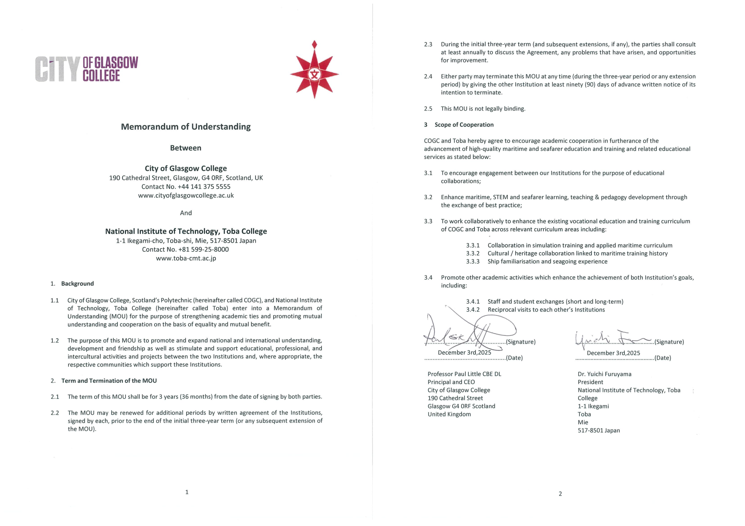 学術交流協定 【国外】 鳥羽商船高等専門学校と英国スコットランド・グラスゴー市大学との協定 鳥羽商船高等専門学校とタイKOSEN-KMITLとの協定 鳥羽商船高等専門学校とベトナムCOIT(College of Indstry and Trade)との協定 鳥羽商船高等専門学校とイスタンブル工科大学との交流協定覚書 シンガポール・マリタイム・アカデミーとの学術交流協定 ハワイ大学カウアイコミュニティーカレッジとの交流協定 【国内】 災害発生時における船舶型基地局の運用等に関する連携協定書 鳥羽商船高等専門学校と農林水産省東海農政局三重県拠点との包括的連携協力に関する協定書 商船系高等専門学校(富山高等専門学校、鳥羽商船高等専門学校、広島商船高等専門学校、大島商船高等専門学校及び弓削商船高等専門学校)と日本内航海運組合総連合会との交流と連携・協力の推進に関する包括協定書 広島大学、海上保安大学校及び商船系高等専門学校との交流と連携・協力の推進に関する包括協定書 三重大学との連携教育プログラムの実施に関する協定書 鳥羽商船高等専門学校と株式会社ZTVとの包括連携に関する協定書 独立行政法人国立高等専門学校機構鳥羽商船高等専門学校と伊勢市との包括連携協定 鳥羽商船高等専門学校と協同海運株式会社との包括連携に関する協定書 海のシリコンバレー「伊勢志摩海洋教育研究アライアンス」協定書 鳥羽商船高等専門学校と三重県との包括的連携に関する協定 皇學館大学と鳥羽商船高等専門学校との包括連携協定に関する協定書 鳥羽商船高等専門学校と中電シーティーアイとの包括連携に関する協定書 三重県における海洋DX研究開発・導入の促進に係る産学官連携協定書 鳥羽商船高等専門学校とKDDI総合研究所、及びKDDI株式会社との包括的連携に関する協定書 和歌山工業高等専門学校と鳥羽商船高等専門学校間における包括連携に関する協定書 鳥羽商船高等専門学校と鳥羽市との包括連携に関する協定書 鳥羽商船高等専門学校と三重県工業研究所との連携協力に関する協定書 豊橋技術科学大学と岐阜工業高等専門学校、沼津工業高等専門学校、豊田工業高等専門学校、鳥羽商船高等専門学校、鈴鹿工業高等専門学校との教育研究交流に関する協定書 鈴鹿高専との相互の連携協力及び共同事業の推進に関する協定 災害時協力協定 災害時等における東海・北陸地区高等専門学校間の相互応援に関する協定書 伊勢市との災害時協力協定 志摩市との災害時協力協定 鳥羽市との災害時協力協定 「学校警察連絡制度」に関する協定書 学術交流協定 【国外】 鳥羽商船高等専門学校と英国スコットランド・グラスゴー市大学との協定(令和7年12月3日) 鳥羽商船高等専門学校とタイKOSEN-KMITLとの協定(令和7年3月31日) 鳥羽商船高等専門学校とベトナムCOIT(College of Indstry and Trade)との協定(令和7年2月8日) 鳥羽商船高等専門学校とイスタンブル工科大学との交流協定覚書(平成26年3月11日) シンガポール・マリタイム・アカデミーとの学術交流協定(平成23年8月26日) ハワイ大学カウアイコミュニティーカレッジとの交流協定(令和5年1月23日) 【国内】 独立行政法人国立高等専門学校機構鳥羽商船高等専門学校と旭タンカー株式会社との包括連携に関する協定書(令和7年7月25日) 災害発生時における船舶型基地局の運用等に関する連携協定書(令和6年11月27日) 鳥羽商船高等専門学校と農林水産省東海農政局三重県拠点との包括的連携協力に関する協定書(令和6年9月4日) 商船系高等専門学校(富山高等専門学校、鳥羽商船高等専門学校、広島商船高等専門学校、大島商船高等専門学校及び弓削商船高等専門学校)と日本内航海運組合総連合会との交流と連携・協力の推進に関する包括協定書(令和6年3月15日) 広島大学、海上保安大学校及び商船系高等専門学校との交流と連携・協力の推進に関する包括協定書(令和6年3月14日) 三重大学との連携教育プログラムの実施に関する協定書(令和6年3月12日) 鳥羽商船高等専門学校と株式会社ZTVとの包括連携に関する協定書(令和5年10月2日) 独立行政法人国立高等専門学校機構鳥羽商船高等専門学校と伊勢市との包括連携協定(令和5年9月7日) 鳥羽商船高等専門学校と協同海運株式会社との包括連携に関する協定書(令和5年9月7日) 海のシリコンバレー「伊勢志摩海洋教育研究アライアンス」協定書(令和4年10月1日) 鳥羽商船高等専門学校と三重県との包括的連携に関する協定(令和4年8月31日) 皇學館大学と鳥羽商船高等専門学校との包括連携協定に関する協定書(令和4年6月24日) 鳥羽商船高等専門学校と中電シーティーアイとの包括連携に関する協定書(令和4年1月14日) 三重県における海洋DX研究開発・導入の促進に係る産学官連携協定書(令和3年3月16日) 鳥羽商船高等専門学校とKDDI総合研究所、及びKDDI株式会社との包括的連携に関する協定書(令和2年11月17日) 鳥羽商船高等専門学校と鳥羽市との包括連携に関する協定書(平成30年3月28日) 和歌山工業高等専門学校と鳥羽商船高等専門学校間における包括連携に関する協定書(