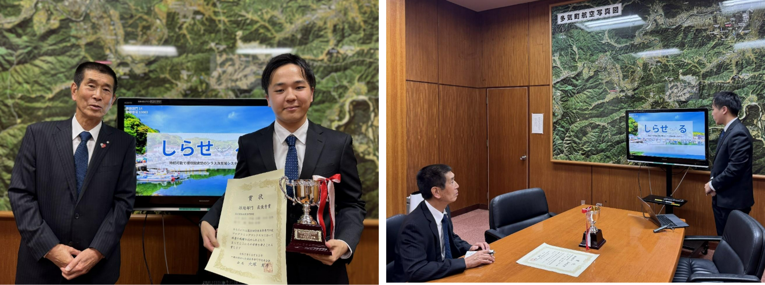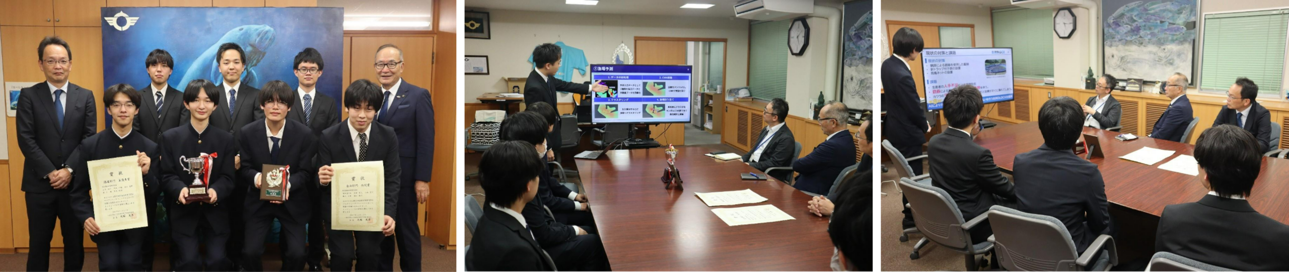 (令和7年12月22日掲載) 第36回全国高等専門学校プログラミングコンテスト(以下、「高専プロコン」)の課題部門において最優秀賞・文部科学大臣賞を、自由部門において特別賞を受賞した学生チームが、令和7年10月24日(金)に多気町、同月27日(月)に鳥羽市、11月25日(火)に伊勢市を表敬訪問しました。 高専プロコンは、全国の高等専門学校生が情報通信技術を活用して開発したシステムを競う大会です。発想力や実現力に加え、システムの完成度や発表力、社会的有用性など、多様な観点から評価が行われ、技術者に必要となる総合的な能力が問われます。今コンテストにおいて、本校から出場した学生チームは、課題部門で最優秀賞・文部科学大臣賞・情報処理学会若手奨励賞・電子情報通信学会若手奨励賞、自由部門で特別賞を受賞しました。 今回の表敬訪問では、学生が自身の出身地である多気町、鳥羽市、伊勢市を訪れ、受賞の報告と今後の抱負を述べました。多気町役場では、多気町出身の学生が久保行央多気町長に作品を紹介し、町長から作品への評価とともに、今後のさらなる活躍を期待するお言葉をいただきました。鳥羽市役所では、小竹篤鳥羽市長からアイデアの背景やシステムがもたらす効果について質問があり、学生は丁寧に説明していました。また、苦労した点について問われた際には、「カメラで対象を検出するための調整に苦労した」と振り返りました。最後に、市長より激励のお言葉をいただきました。伊勢市役所では、鈴木健一伊勢市長からデータ精度や漁獲量の調整に関する質問があり、学生が説明を行いました。市長からは「今後も頑張ってください」との励ましのお言葉をいただきました。 ◆多気町長表敬訪問の様子 ◆鳥羽市長表敬訪問の様子 ◆伊勢市長表敬訪問の様子 概要 <多気町長表敬訪問> ◆日時 令和7年10月24日(金) ◆場所 多気町役場 (三重県多気郡多気町相可1600) <鳥羽市長表敬訪問> ◆日時 令和7年10月27日(月) ◆場所 鳥羽市役所 (三重県鳥羽市鳥羽三丁目1番1号) <伊勢市長表敬訪問> ◆日時 令和7年11月25日(火) ◆場所 伊勢市役所 (三重県伊勢市岩渕1丁目7番29号) ◆訪問者 第36回全国高等専門学校プログラミングコンテスト ・課題部門 最優秀賞・文部科学大臣賞・情報処理学会若手奨励賞・電子情報通信学会若手奨励賞を受賞した学生チーム ・自由部門 特別賞を受賞した学生チーム ・指導教員 江崎修央教授(情報機械システム工学科) この記事をシェアする 本件に関するメディア掲載 夕刊三重 令和7年10月25日掲載 https://yomotto.jp/2025/10/25/3451183/ ZTV いせトピ 令和7年12月1日~3日放送 問い合わせ 記事・その他に関すること 鳥羽商船高等専門学校 総務課 総務係(広報担当) 0599ー25ー8013 soumu-soumu@toba-cmt.ac.jp 鳥羽商船高等専門学校の日常やお知らせをSNSで発信しています。