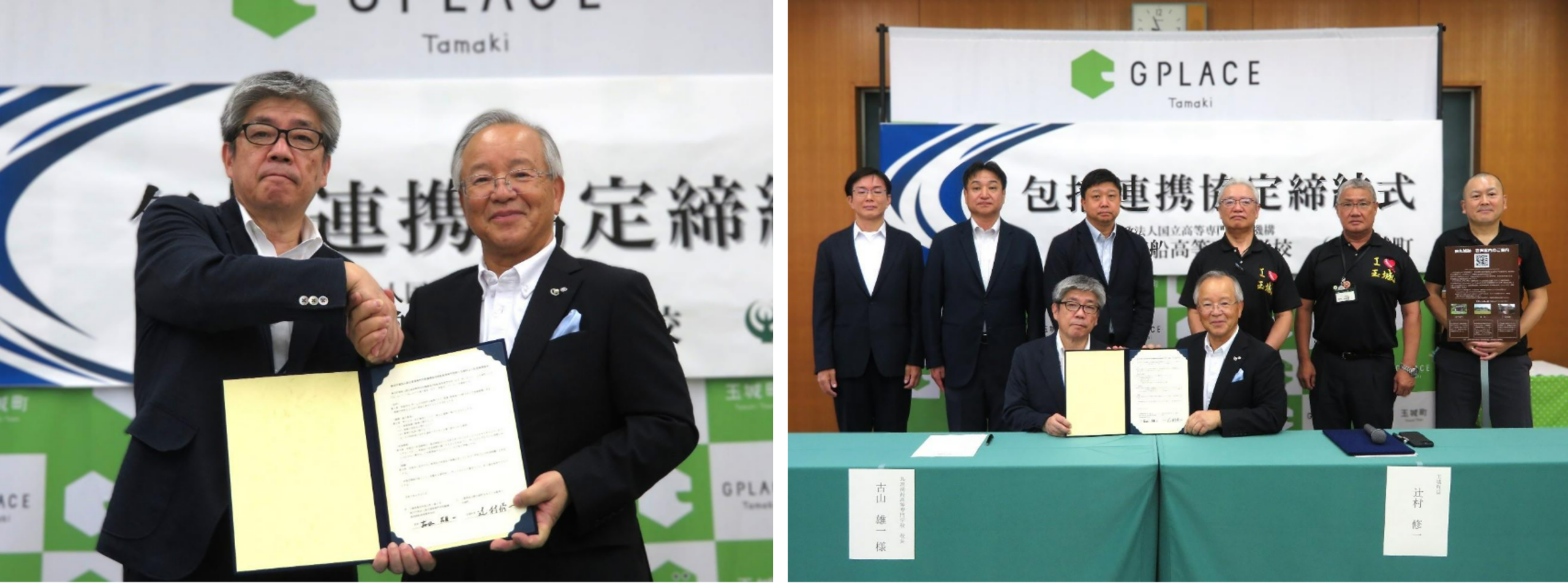 (令和7年10月2日掲載) 鳥羽商船高等専門学校は、令和7年9月30日、三重県度会郡玉城町と包括連携協定を締結しました。 本校情報機械システム工学科では、地域連携 Project Based Learning(以下、「PBL」)という授業を通じ、ものづくりで培った知識と技術を活かした地域課題の解決に取り組んでおり、1年生から5年生までの複数学年で構成されるチームが、短期・中期・長期の視点から様々な課題に挑戦しています。 同学科の中井一文准教授が主宰する研究室では、PBLにおいて玉城町の地域課題解決を目的としたアプリケーション開発を 2018 年より継続して実施しており、毎年新たなアプリケーションを玉城町に提供してきました。今回の協定締結は、これまでの取組を基盤に、より多角的かつ持続的な連携を進めていくことを目的としています。 協定書に調印した後、古山雄一校長は「玉城町は、高齢化による地域のつながりの希薄化、観光資源の案内不足といった課題に対して真摯に向き合っていると伺いました。本校は、これら課題解決を支援するため、アプリケーション開発という点で協力しており、さらに観光地の振興に資する研究も進めています。今回の協定締結を機に、玉城町と本校との連携がさらに深まり、地域の活性化と人材育成に寄与できることを、教職員一同、心より願っております」と挨拶を述べました。また、辻󠄀村修一玉城町長からは「様々な分野において連携を深めていきたい」という話がありました。 本校は、今後も、地域と連携しながら、ものづくりの知識と技術を活かした課題解決や研究活動を推進し、地域の発展と人材育成に貢献してまいります。 概要 鳥羽商船高等専門学校と玉城町との包括連携協定締結式 ◆日時 令和7年9月30日 ◆場所 玉城町役場 (三重県度会郡玉城町田丸114-2) ◆出席者 <鳥羽商船高等専門学校> 古山 雄一 校長 江崎 修央 副校長・教務主事 出江 幸重 研究主事 中井 一文 准教授 <玉城町> 辻󠄀村 修一 町長 田間 宏紀 副町長 山村 嘉寛 教育長 中川 泰成 まちづくり推進課長 里中 和樹 産業振興課長 本件に関する問い合わせ 鳥羽商船高等専門学校 総務課 総務係(広報担当) 0599ー25ー8013 soumu-soumu@toba-cmt.ac.jp 鳥羽商船高等専門学校の日常やお知らせをSNSで発信しています。 ぜひご覧ください。