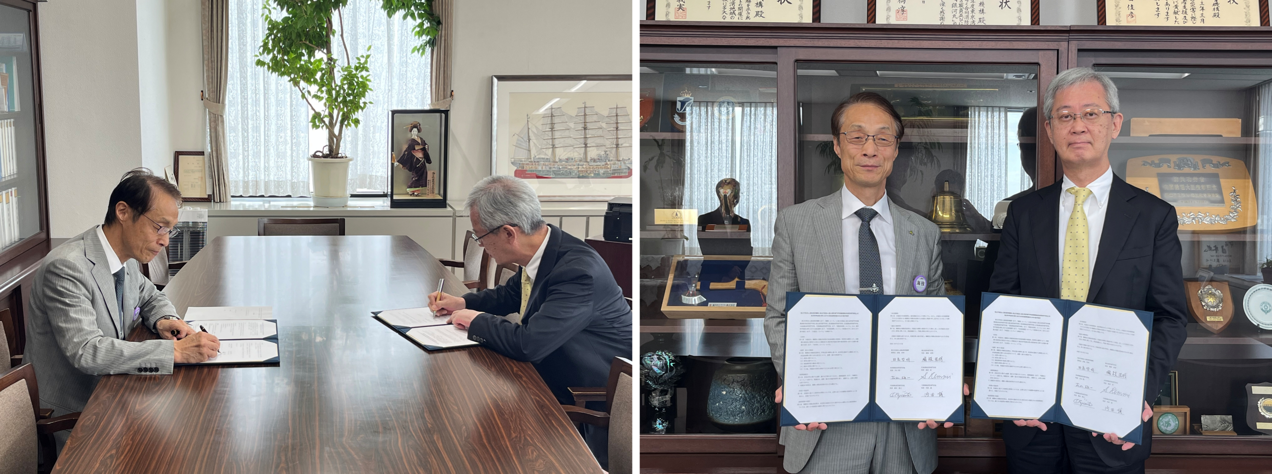 (令和7年10月22日掲載) 調印式の様子|國枝佳明富山高等専門学校長(左)と田島哲明海技教育機構理事長(右) 独立行政法人国立高等専門学校機構商船系高等専門学校(富山高等専門学校、鳥羽商船高等専門学校、広島商船高等専門学校、大島商船高等専門学校、弓削商船高等専門学校。以下、「商船系高専」という。)と独立行政法人海技教育機構(以下「JMETS」という。)は、令和7年9月30日、「海洋科学技術分野における包括連携推進のための基本協定」を締結しました。 本基本協定は、文部科学省所管の商船系高専、国土交通省所管のJMETSが互いに協力し、従来の枠組みを超えた協働による船員養成を推進することを目指し、その体制構築を図るものです。 これは、本年6月にとりまとめが行われた国土交通省の「海技人材の確保のあり方に関する検討会」において、船員養成機関同士の連携を強化し、従来の枠組みを超えた協働による船員養成につなげるため、施設・設備等のさらなる有効活用等について関係者間で課題を整理し、解決策を示すことが求められていることを受けたものです。また、同じく本年4月にとりまとめが行われた「(独)海技教育機構の中期的なあり方に関する検討会」においても、「教員(教官)・乗組員の不足解消」のための取り組みの必要性が指摘されました。 本基本協定の締結により、両組織は、海技教育者の人材育成を互いに協力して実施し、教員・教官不足に対する相互の協力、人事交流など、従来の枠組みを越えた船員養成を行うための体制構築を図り、より質の高い船員養成に繋げていくことを目指してまいります。 概要 JMETSと商船系高等専門学校との基本協定締結 ◆締結日 令和7年9月30日(火) ◆基本協定締結機関 独立行政法人海技教育機構(JMETS) 独立行政法人国立高等専門学校機構商船系高等専門学校 (富山高等専門学校、鳥羽商船高等専門学校、広島商船高等専門学校、大島商船高等専門学校、弓削商船高等専門学校) ◆目的 JMETS及び商船系高専が本包括連携を効果的、効率的に運用することにより、各機関の教育及び研究力の向上と発展並びに海洋科学技術分野の教育研究に資する活動を推進していくことを目的とする。 ◆協定の対象となる項目 (1) 教育に関すること。 (2) 研究に関すること。 (3) 海技教育者の養成に関すること。 (4) 施設の利用に関すること。 (5) その他、本協定の目的を達成するために必要と認めること。 本件に関する問い合わせ 鳥羽商船高等専門学校 総務課 総務係(広報担当) 0599ー25ー8013 soumu-soumu@toba-cmt.ac.jp 鳥羽商船高等専門学校の日常やお知らせをSNSで発信しています。 ぜひご覧ください。