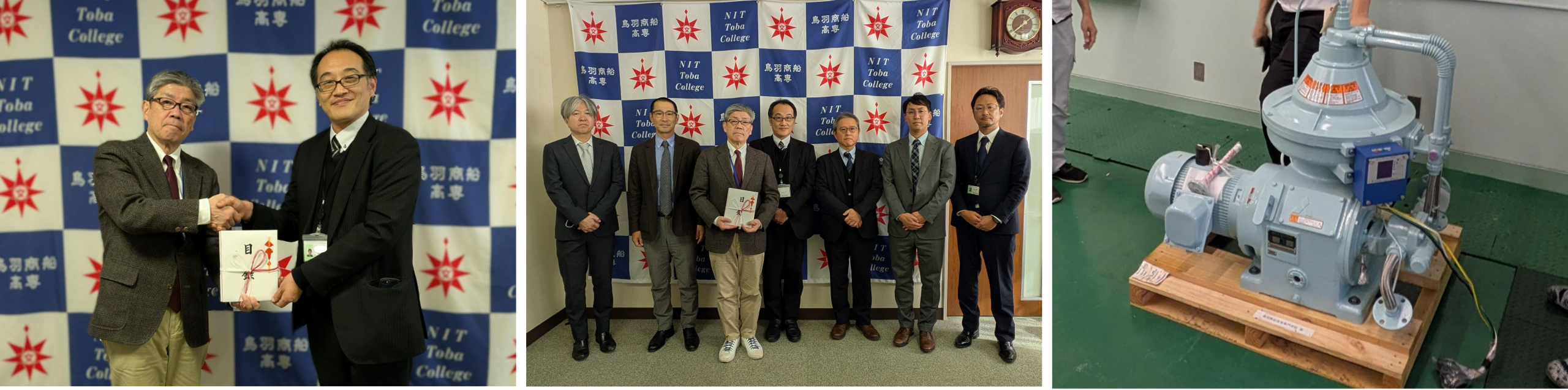 (令和7年12月5日掲載) 鳥羽商船高等専門学校は、三菱化工機株式会社より油清浄機の寄贈を受け、令和7年11月18日(火)、寄贈式を実施しました。 油清浄機は、船舶に搭載される装置で、燃料油に含まれる水分や不純物を遠心力によって分離・除去し、清浄化するものです。これにより、エンジンにきれいな燃料油を供給でき、燃焼効率の向上や機器部品の故障防止につなげることができます。そのため、油清浄機の定期的な点検や清掃は、機関士にとって欠かせない作業となっています。 寄贈式において、古山雄一校長は「このような貴重な機器を寄贈していただき有難く思います。学生の実習で大いに活用していきたいと考えています」と述べ、油清浄機を受け取りました。 このあと、寄贈された油清浄機の分解・清掃・組立に関するレクチャーが行われ、本校商船学科機関コースの教員が受講しました。手順や注意点などについて詳細に説明され、教員は講師への質問を交えながら理解を深めていました。 本校商船学科機関コースでは、今回寄贈された装置を用い、油清浄機の分解・清掃・組立といった実習を行う予定です。最新型の実習機材を活用することで、学生はより実践的な技術や知識を身につけることができると期待されます。 概要 油清浄機の寄贈式 ◆日時 令和7年11月18日(火) 13:30~14:00 ◆場所 鳥羽商船高等専門学校 (三県鳥羽市池上町1番1号) ◆出席者 <三菱化工機株式会社> 舶用機械営業部 舶用機械アフターサービス課 <広菱産業有限会社> 伊豫本圭司 代表取締役社長 <鳥羽商船高等専門学校> 古山雄一 校長 鎌田功一 商船学科長 窪田祥朗 教授(商船学科) この記事をシェアする 問い合わせ 記事・その他に関すること 鳥羽商船高等専門学校 総務課 総務係(広報担当) 0599ー25ー8013 soumu-soumu@toba-cmt.ac.jp 鳥羽商船高等専門学校の日常やお知らせをSNSで発信しています。