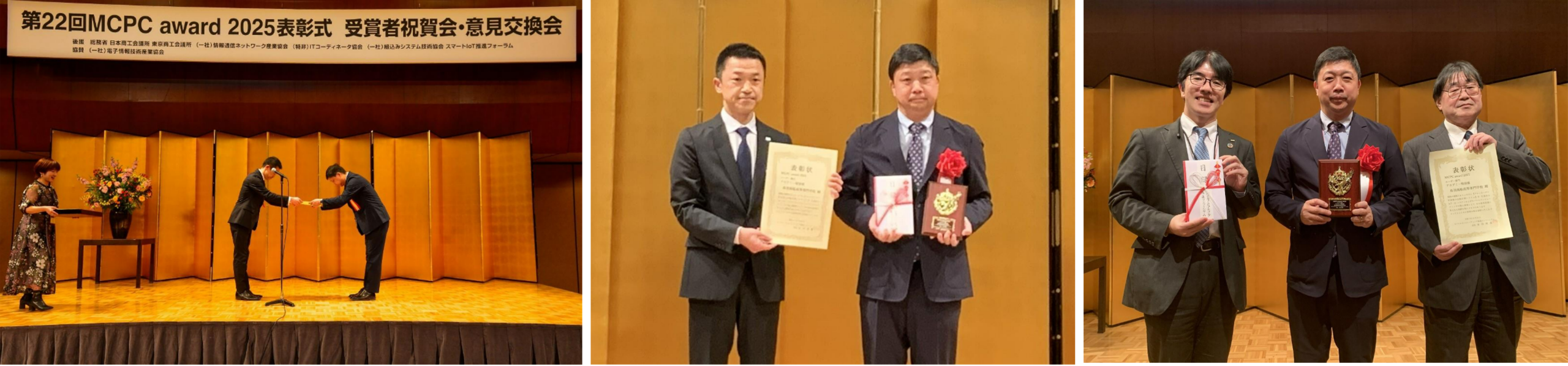 (令和7年12月19日掲載) モバイルコンピューティング推進コンソーシアムが主催する「MCPC award 2025」で、鳥羽商船高等専門学校がNICTの助成研究で開発を進めた「ブルーカーボン貯留量の自動計測システム」がアカデミー特別賞を受賞しました。これに伴い、令和 7 年 11 月 26 日(水)、 東京プリンスホテルで開催された表彰式に、情報機械システム工学科江崎修央教授が出席し賞状の授与を受けました。 「MCPC award 2025」は、モバイルコンピューティング推進コンソーシアム(MCPC)が、業界の枠を越えてモバイルコンピューティングや IoT/M2Mシステムの普及を促進することを目的に設立した表彰制度です。モバイルシステムの導入により「業務効率化」「業績向上」「顧客満足度向上」「社会貢献の推進」「先進的なモバイル活用」などで成果を上げた事例を顕彰しています。 今回アカデミー特別賞を受賞したのは、本校情報機械システム工学科の学生が開発に携わった「ブルーカーボン貯留量の自動計測システム」です。本システムは、藻場の繁茂状況を自動で計測し、炭素貯留量を算出するもので、低コストかつ高い機動性を特徴としています。船の側面に取り付け可能な水中カメラと映像収集装置を複数の船に搭載して計測を行い、効率的なデータ収集を実現しました。 また、この取り組みは、国立大学法人三重大学、三重県水産研究所、三重県鳥羽市、KDDI 株式会社および 株式会社 KDDI 総合研究所との共創により進められており、海洋DXの研究開発・導入促進における先駆的事例としても注目されています。 現在は、三重県鳥羽・志摩地域の藻場を対象に試験運用を実施しており、地域の海洋環境保全や脱炭素社会 の実現に貢献する技術として、今後のさらなる発展が期待されます。 概要 MCPC award 2025 表彰式 ◆日時 令和7年11月26日(水) 16:00~17:30 ◆場所 東京プリンスホテル 3 階 プロビデンスホール (東京都港区芝公園 3 丁目 3 番 1 号) ◆受賞 ユーザー部門 アカデミー特別賞 ◆本校からの出席者 情報機械システム工学科 江崎修央 教授 ◆主催 モバイルコンピューティング推進コンソーシアム ◆後援 総務省 日本商工会議所 東京商工会議所 情報通信ネットワーク産業協会 IT コーディネータ協会 組込みシステム技術協会 スマート IoT 推進フォーラム ◆協賛 電子情報技術産業協会 ◆参考 「MCPC award 2025」の最優秀賞・グランプリ/総務大臣賞および各省が決定しました|MCPC この記事をシェアする 問い合わせ 記事・その他に関すること 鳥羽商船高等専門学校 総務課 総務係(広報担当) 0599ー25ー8013 soumu-soumu@toba-cmt.ac.jp 鳥羽商船高等専門学校の日常やお知らせをSNSで発信しています。