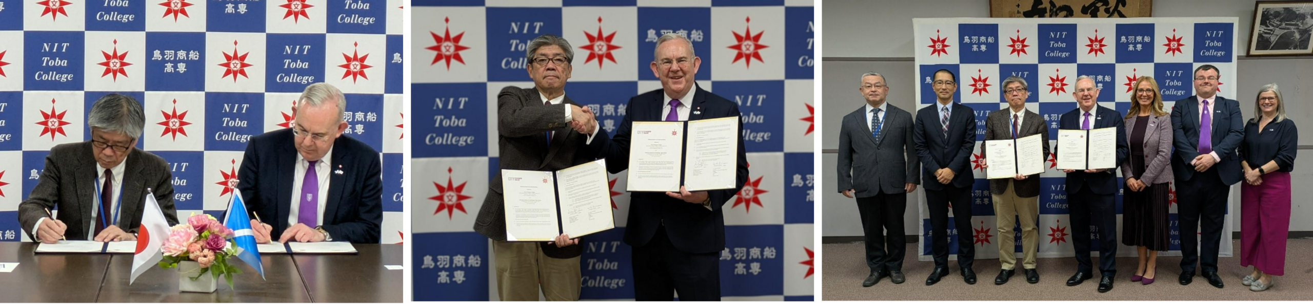 (令和7年12月23日掲載) 鳥羽商船高等専門学校(以下、「鳥羽商船高専」)は、令和7年12月3日(水)、英国スコットランド最大の技術教育機関であるCity of Glasgow College(以下、「グラスゴー市立大学」)と海事教育分野における学術交流を目的としたMemorandum of Understanding(以下、「MOU」)を締結しました。 グラスゴー市立大学は、2010 年に Central College、Glasgow Metropolitan College、Glasgow College of Nautical Studies の 3 校が統合して設立された、英国スコットランド最大の技術系高等教育機関です。造船・金属・機器産業で発展してきた都市グラスゴーを拠点とし、海事分野をはじめ多様な技術領域で人材育成に取り組んでいます。令和 7 年 8 月には、グラスゴー市立大学の学長兼最高責任者であるDr. Paul Little 氏らが本校を訪れ、海事教育に関する意見交換が行われました。この訪問では、日英の教育制度やカリキュラム、船員教育に使用される設備など について活発な議論が行われました。 今回締結するMOUでは、双方の海事教育のさらなる発展を目指し、関連分野における連携強化を進めていくことで基本合意しました。シミュレータを用いた訓練、海事教育の歴史・文化、船舶習熟訓練、航海実習等に関する協力に加え、学生および教職員の短期・長期交換留学や、相互訪問などの交流促進が盛り込まれています。 調印後、古山雄一校長は「本校とグラスゴー市立大学がMOUを締結できたことをとても嬉しく思います。日本の海事教育は英国に倣って発展してきた歴史があります。そのような背景のもと、本校が英国の高等教育機関と協力し、海事教育をさらに発展させいけることを光栄に思います。」と述べました。 グラスゴー市立大学のポール リトル学長兼最高責任者は「鳥羽商船高専との連携を強化できることを喜ばしく思います。グラスゴー市立大学はこれまで多くの国の教育機関と連携し、学生を受け入れてきました。今回の連携が本学にとって40校目となり、東アジア地域では初の提携校です。今後、この連携をさらに発展させていけることを期待しています。」等と述べました。 今後、本校は本MOUに基づき、国際的な視点を取り入れた海事教育の充実を図るとともに、学生の国際的な活躍を支援し、グローバルに通用する海事技術者の育成に取り組んでまいります。 概要 鳥羽商船高等専門学校とグラスゴー市立大学の学術交流に関するMOU締結 ◆日時 令和7年12月3日(水) ◆場所 鳥羽商船高等専門学校 (三重県鳥羽市池上町1番1号) ◆参加者 <City of Glasgow College> Dr Paul Little, Principal & CEO Ms Carla Gethin, Vice Principal Corporate Development & Innovation Mr Kevin Ward, Associate Dean (Maritime) Ms Jacqui Massie, Associate Director (Business Partnerships) <鳥羽商船高等専門学校> 古山 雄一 校長 鎌田 功一 商船学科長 喜井 健二 事務部長 この記事をシェアする メディア掲載 日本海事新聞 2025年12月10日(水)掲載(紙面および電子版) 関連する記事 英国スコットランドのグラスゴー市立大学長と副学長が本校を視察しました | 鳥羽商船高等専門学校 問い合わせ 記事・その他に関すること 鳥羽商船高等専門学校 総務課 総務係(広報担当) 0599ー25ー8013 soumu-soumu@toba-cmt.ac.jp 鳥羽商船高等専門学校の日常やお知らせをSNSで発信しています。